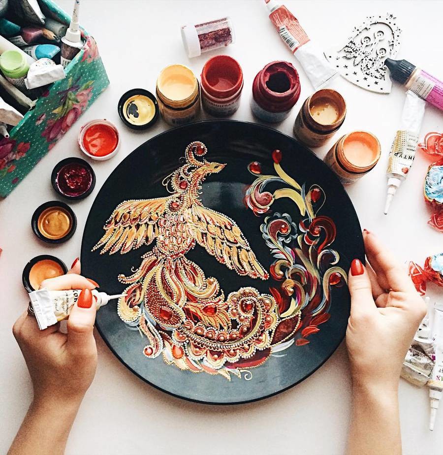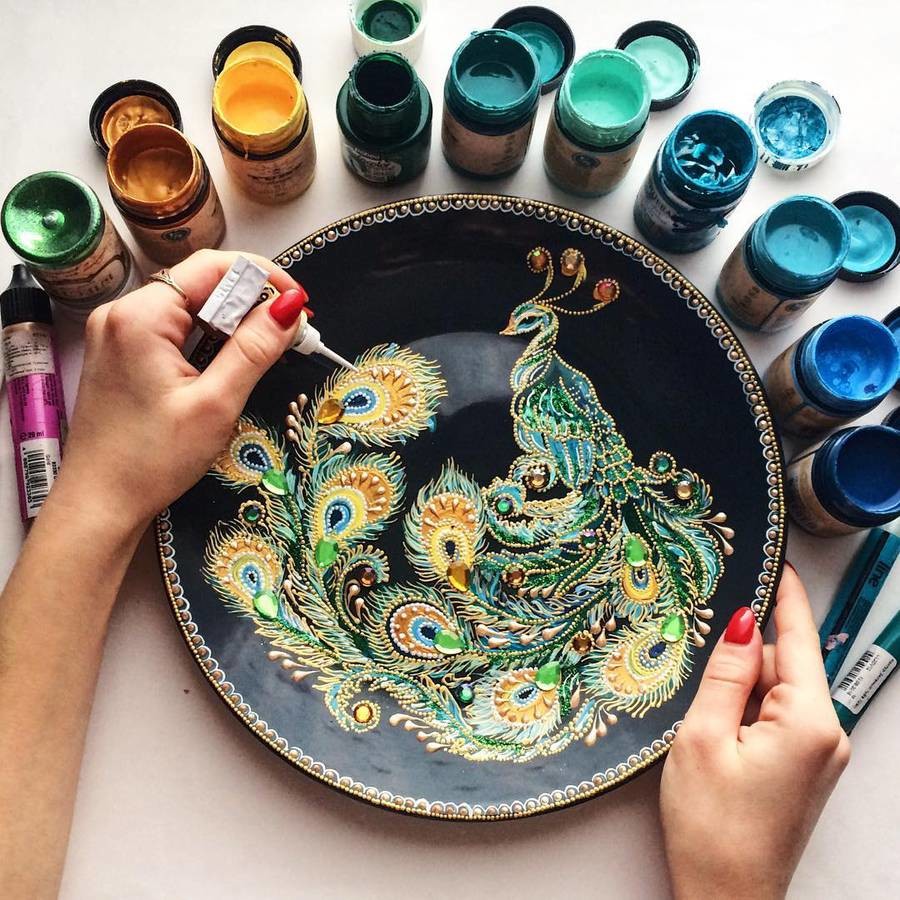 在社交网络上ID为Dahhhanart的艺术家,在圆盘上使用油墨创造出惊艳的点画艺术品。她使用丙烯酸,搪瓷和宝石为她的作品上色,制造出浮雕的立体层次,以极为精准的工艺绘制鸟雀和曼荼罗。
