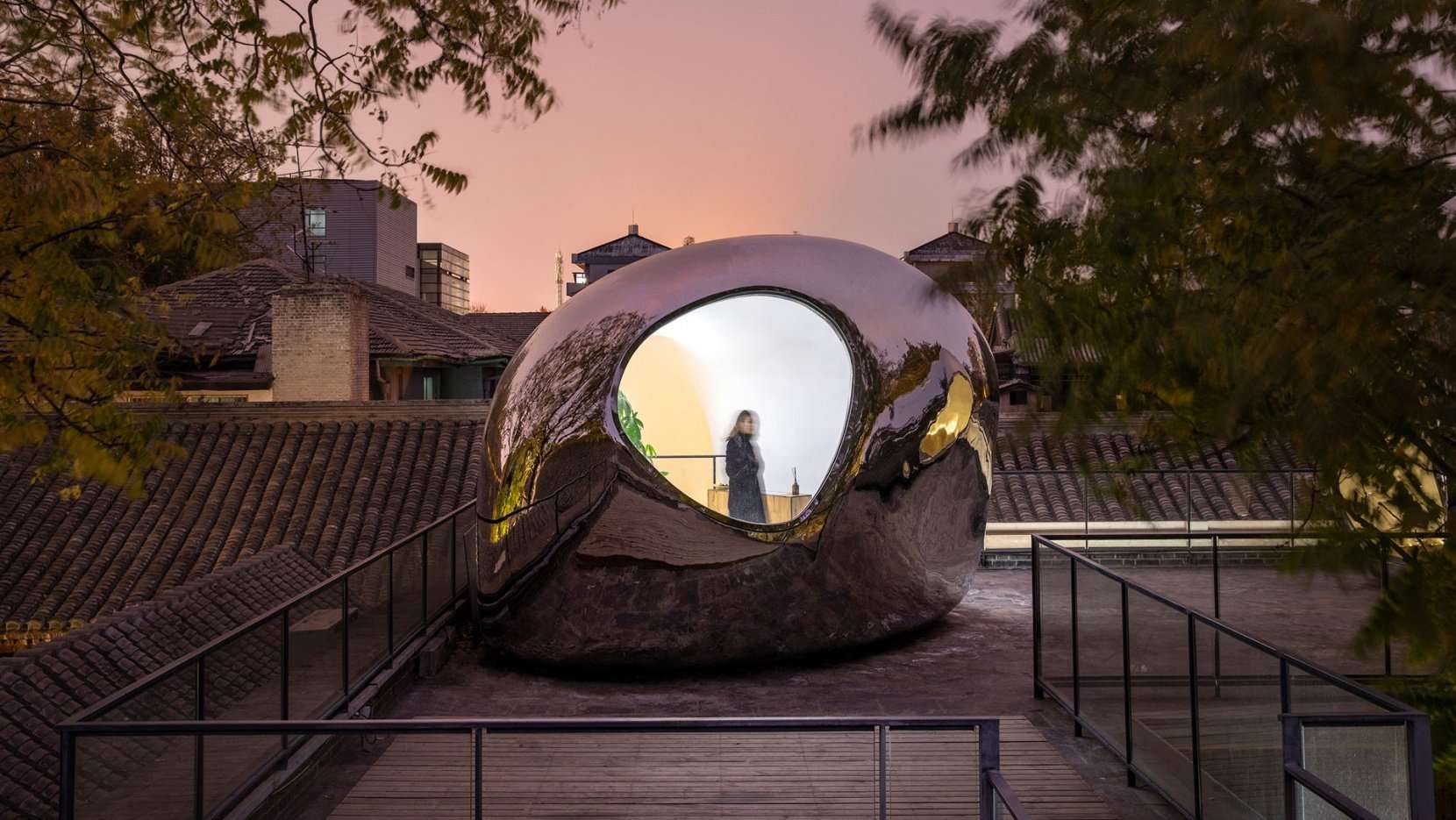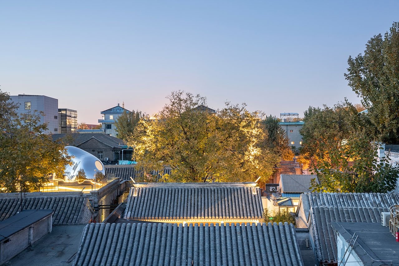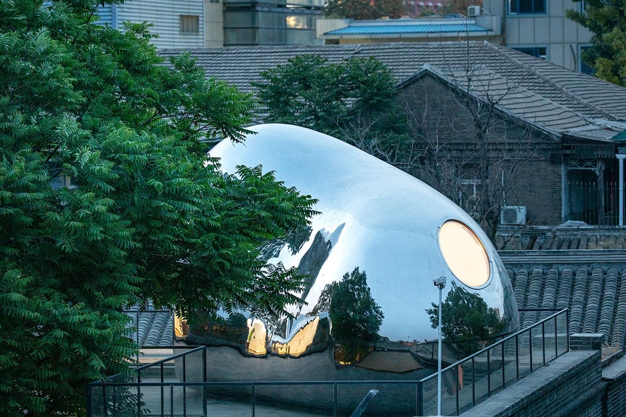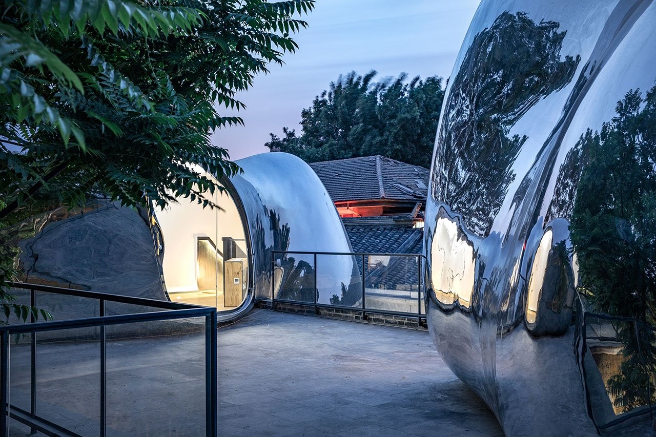 MAD建筑事务所的北京旧城改造项目“胡同泡泡218号”对前门东区的一座清末四合院进行的修复和改造。在恢复四合院原有三进格局的同时,创造性地加入了三个不同形态、犹如来自外星球的金属“泡泡”。艺术轻触社区,新与旧、传统与未来在老城里创造了新的对话空间。“泡泡”本身也是实用空间,其内部构成了楼梯和顶层茶室。