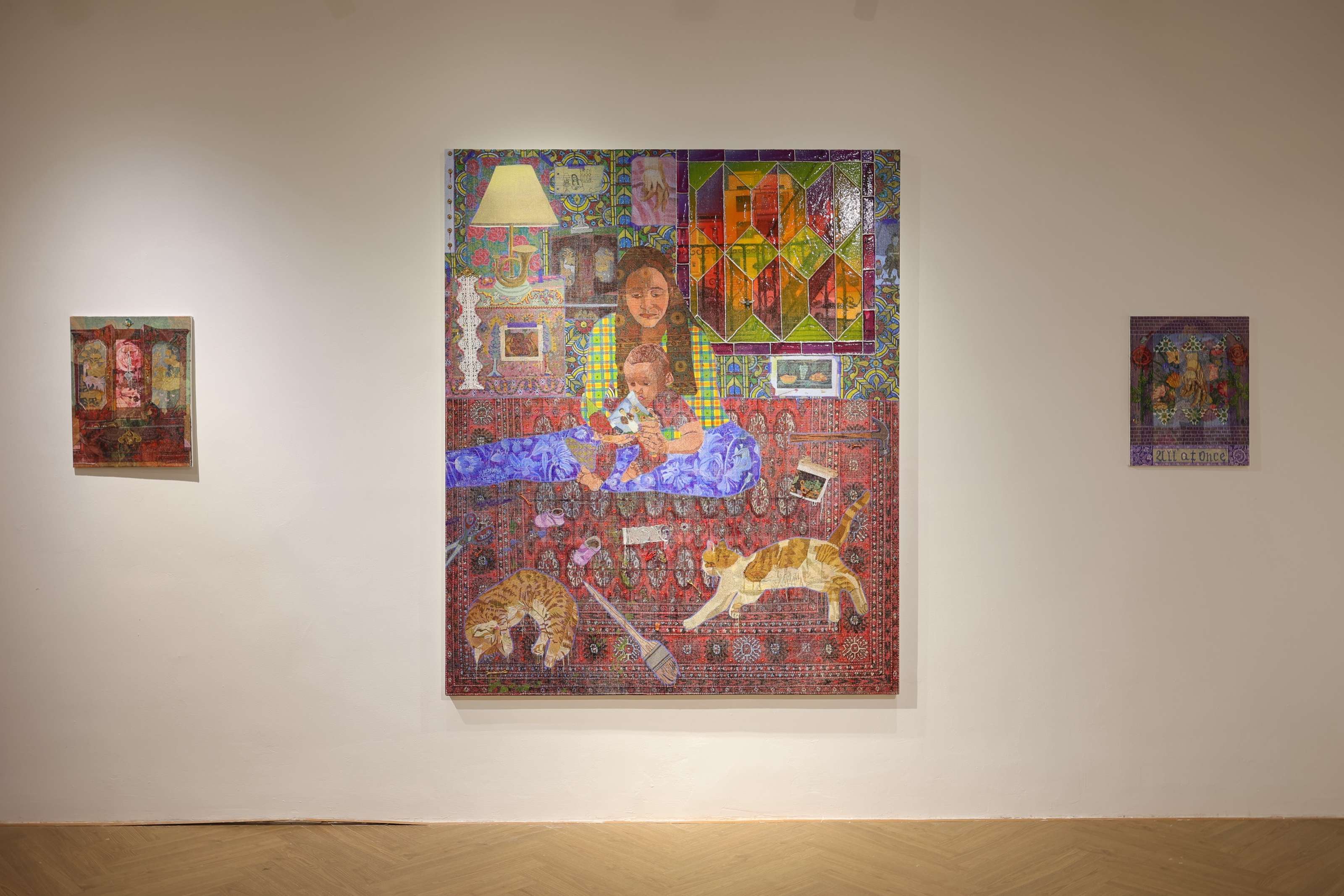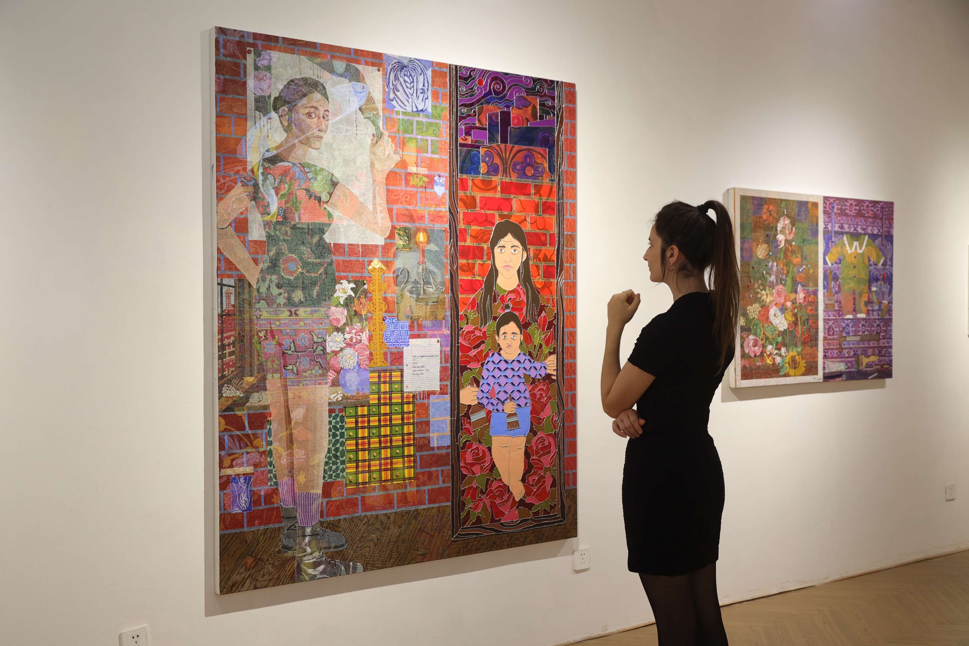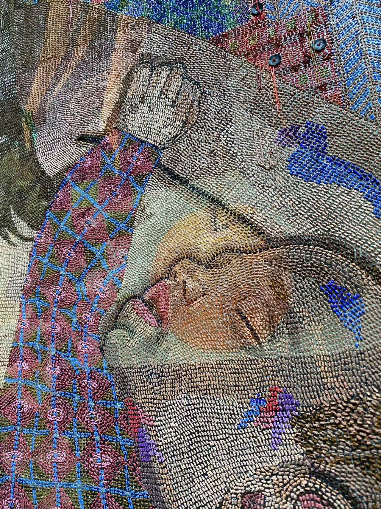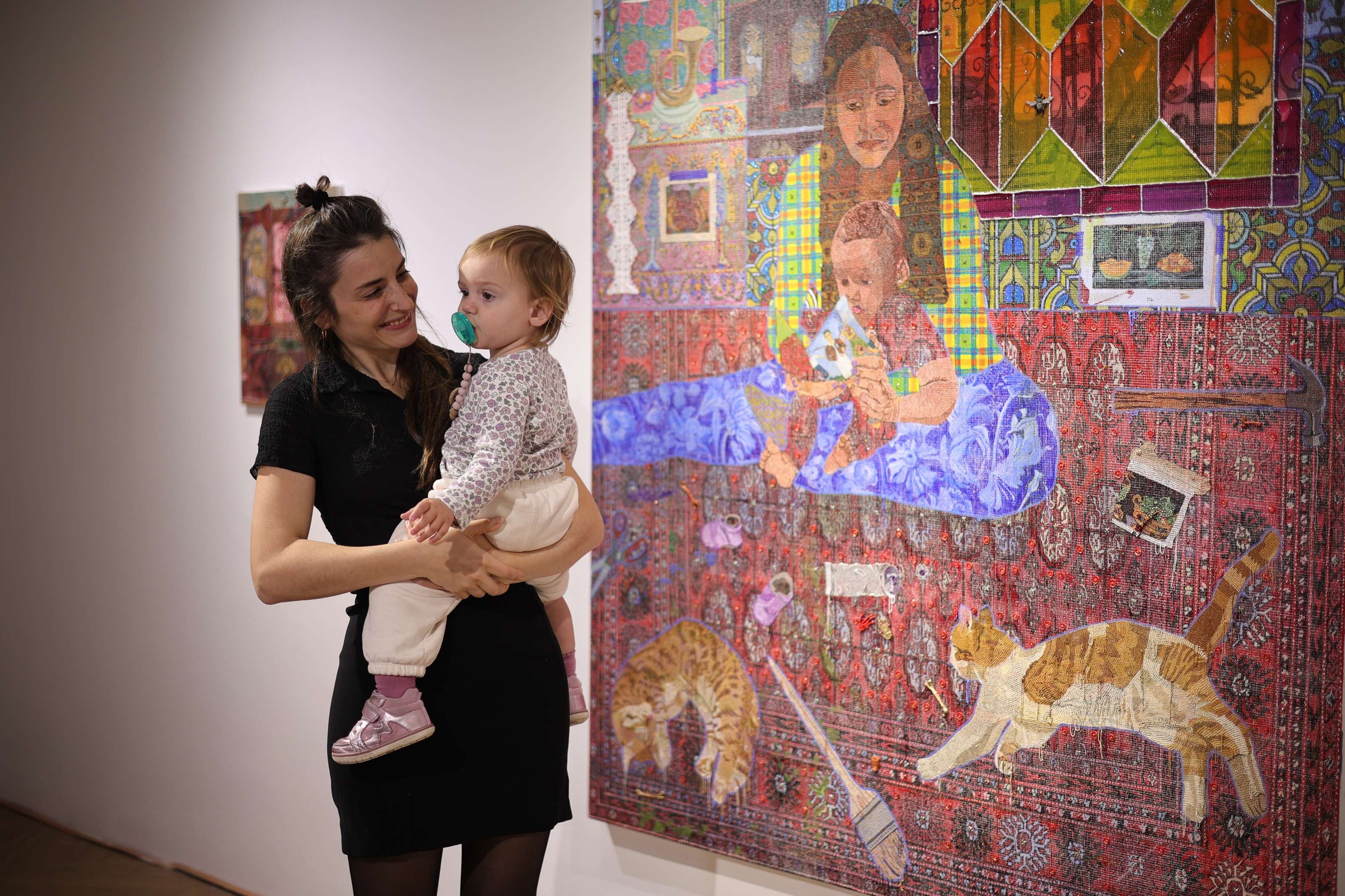 她对“织物”的兴趣并非停留在技法层面。更深层的是对家庭、日常与艺术史的重叠叙事。她近年的作品中常出现女儿的身影,“那是一种既疲惫又温柔的状态。成为母亲、成为监护者的同时依然持续创作。”她把这些经验转化为视觉语言,让私人记忆与更宏大的文化仪式交织。