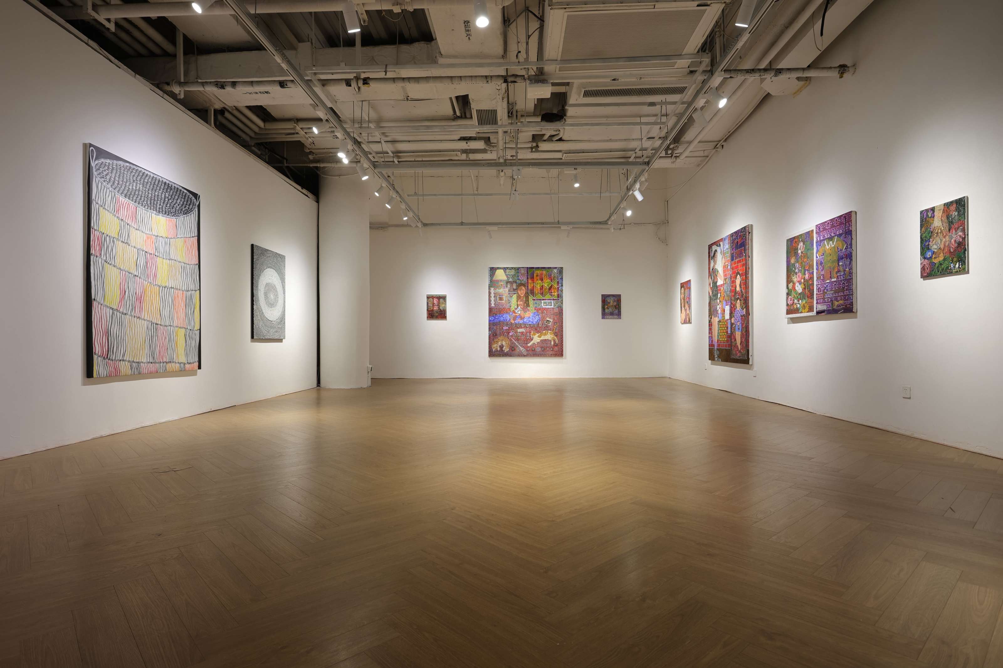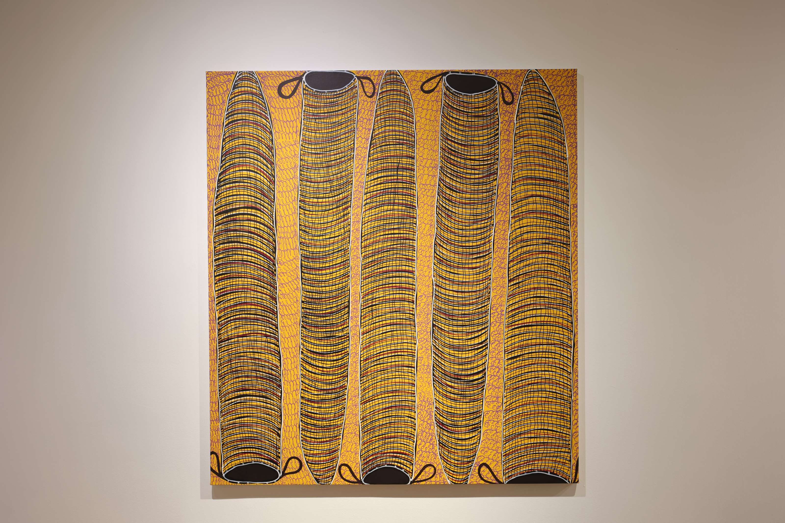 与她共同参展的Kierren Karritpul来自澳大利亚的恩根吉伍米里社群。虽然在他所在的传统中,男性并不是参与编织的主体,但他以绘画的方式重新“编织”世界。两人的作品都源自织物的意象,却从不同的方向展开。Karritpul从宏观视角呈现编织的韵律,而Levitt则从微观笔触重构布料的质感。