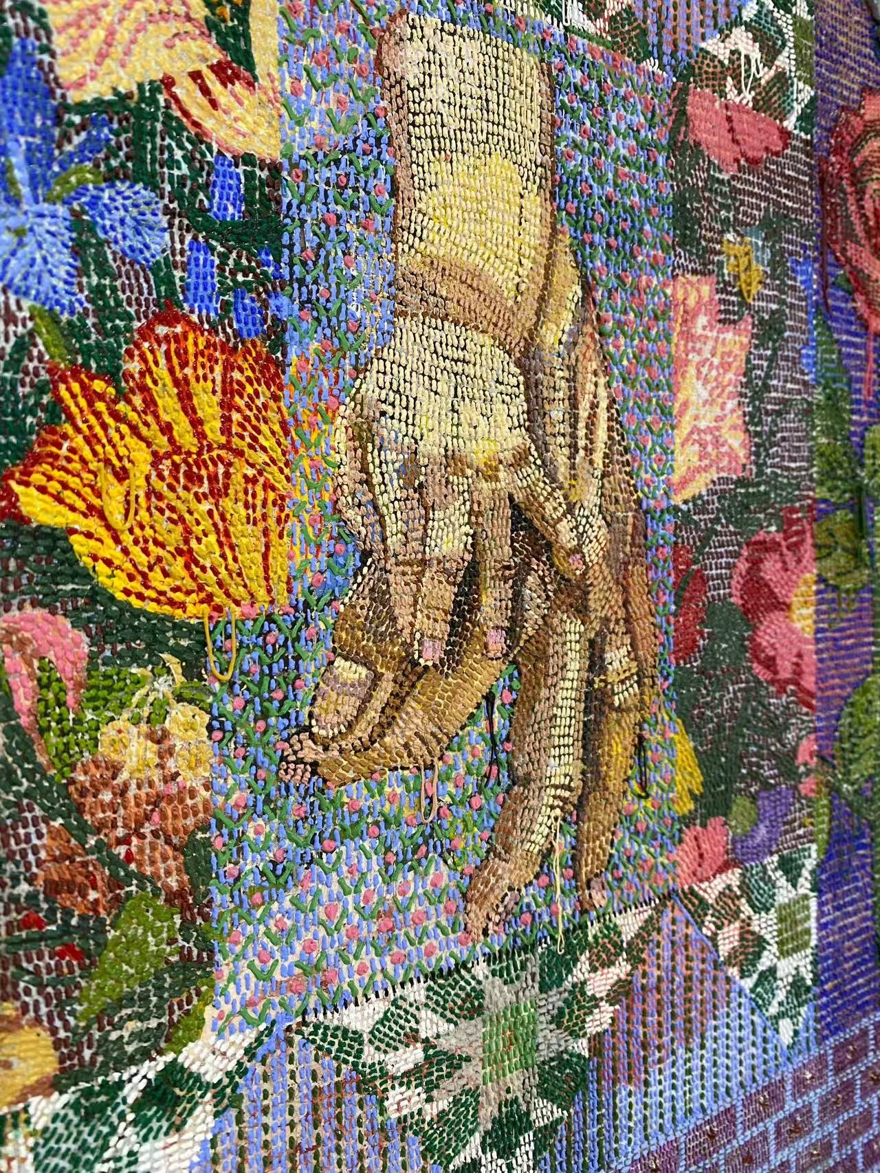 “他的画让人远看像是一整张编织物,靠近才发现那是颜料;而我的作品恰好相反。我们都在用各自的方式‘拆解’编织,也在重新理解它。这次的标题很有意思,”她笑着说,“它意味着解开,也意味着理解。当你花时间慢慢看一幅画,它就会一点点地被‘解开’,那些线索会自己浮现出来。”在她看来,创作正是这种反复的编与解——在一针一线、一层一层的笔触中,记忆被重新缝合,情感也被织进了画面之中。